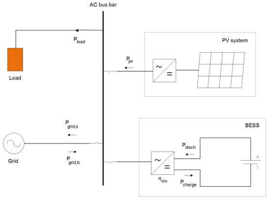 The system can be modeled simply as a grid-connected photovoltaic (PV) + battery energy storage system (BESS) supplying a load. It should be noted that a lithium-ion battery is chosen for this study, as it is by far the most dominant technology of choice for behind-the-meter storage systems [,]. It is also worth mentioning that the BESS is simplified to contain only a battery bank and a bi-directional converter, and the effects of all other storage components are neglected.