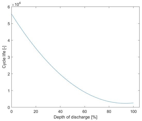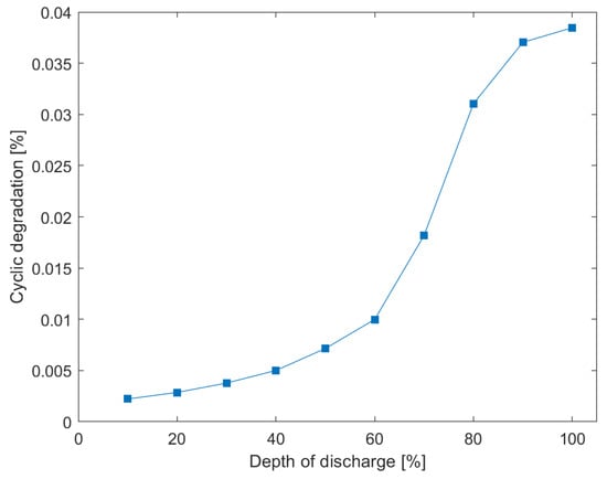 Modeling the cyclic aging of a battery is difficult as it depends on both the energy throughput, cell chemistry, and operating conditions, such as temperature, cell voltage, and DOD. As such, no single model can be used for all chemistries, and a near accurate representation of the cyclic aging for each chemistry would be a highly non-linear function. Several methods have been proposed [,]; however, the model used in this paper is based on the curve from Figure 2: the degradation of each regular cycle, i.e., when discharging the battery from full capacity to a specified DOD level, is modeled as , where Lcyc is the cycle life of the resulting DOD and is the percentage degradation in time t. A similar model is also used by References [,]. Although being cell specific, it can easily be adapted to fit all chemistries where such a curve is available and can therefore produce accurate results for the chosen battery technology.