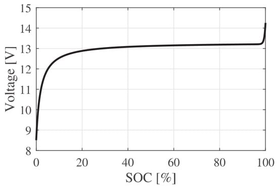 The available energy in time t is controlled by the usable capacity as well as the minimum and maximum levels of the state of charge, , where and are given as percentages. This is set to avoid overcharge or deep discharge. As seen in Figure 3, the open circuit voltage of a lithium-ion battery is relatively constant in the SOC range of 10%–90%, so operation in this region is preferable. For this study, the battery voltage is assumed to be constant over the whole charge and/or discharge cycle.