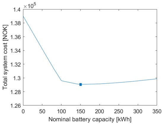 As can be seen from the figure, the optimal battery capacity is found to be 150 kWh. The resulting value of for this scenario was 455.38 kWp. It can also be observed that increasing the battery size beyond the optimal value has only a slight effect on the total system cost; while being more expensive, a larger battery will be able to provide additional peak shaving.