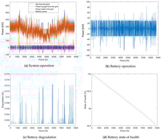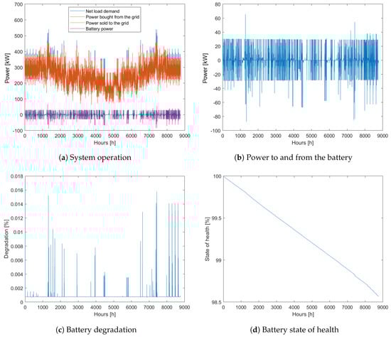 As can be seen from Figure 7a, the battery is active during large amounts of the year; however, the net load is always positive. As such, the battery is supplied with energy from the grid when needed. It can also be seen that no power is sold to the grid and that the battery supplies the load with power during hours of high peak demands to shave the peaks. However, peak shaving comes at a price: charging and discharging the battery with large amounts of power causes the battery to degrade faster, as seen when comparing Figure 7b,c. After one year of operation, the SOH of the battery is reduced to 98.57% as seen from Figure 7d.