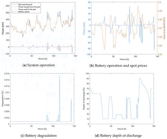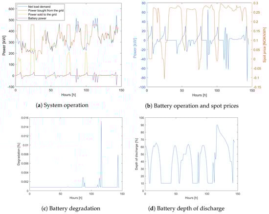Studying Figure 14a in correlation with Figure 14b shows an interesting phenomenon: when subject to spot prices equal to or below zero, the system buys as much power as possible from the grid within limitations, and feeds the excess power back to the grid after supplying the load and charging the battery. As for the 2018 scenario, the battery charges during hours of low spot prices and discharges when the prices are high, except during hours of high peaks. When comparing Figure 14b–d with the 2018 scenario, it can be seen that the battery is slightly more active. However, the degradation profiles are the same.
