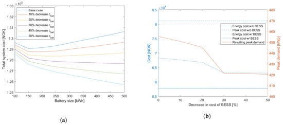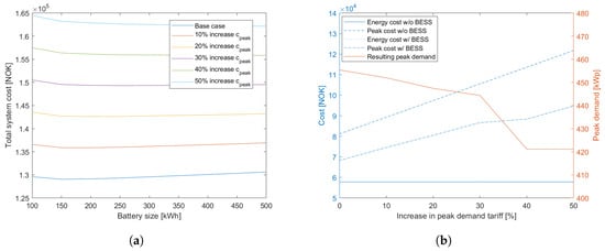 As can be seen from Figure 10a, both the total system cost and the optimal battery capacity increases when increasing the peak demand tariff. For a 50% increase in cpeak, the total system cost increases by 25.6%, taking the optimal storage capacities into account.