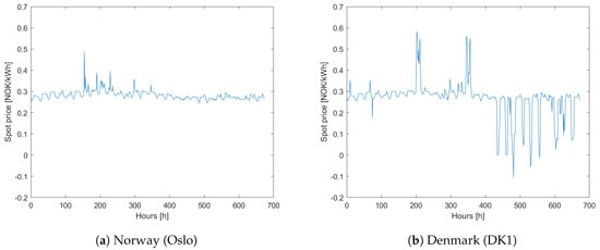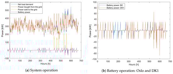 As can be seen from the figures, the day-ahead prices for Denmark (DK1) fluctuate more, with the prices being negative for several hours. This phenomenon can occur when the power generation from high inflexible sources exceeds the demand as they cannot be shut down and restarted in a cost-efficient manner []. In order to see how the system operates under more volatile price signals, the proposed system has been simulated using the spot prices from Denmark. All other parameters remain unchanged. The results are shown in Figure 12a. The battery operation under both Norwegian and Danish spot prices is shown in Figure 12b.