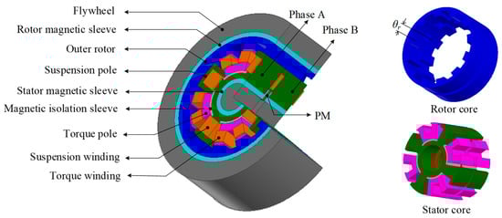 Figure 1 shows the topology of the proposed ASPBF machine. The outer rotor is mounted on the inner side of the flywheel and integrated with the flywheel. The stator and the rotor core are divided into two sections, namely phase A and phase B, according to the phase number in the axial direction, and the axially-magnetized permanent magnet (PM) is arranged between the two-phase stator cores. Each phase adopts an inner stator outer rotor 12/12 pole structure. The inner stator core is divided into a torque pole and a suspension pole. The magnetic isolation sleeve is arranged between the suspension pole and the torque pole to structurally weaken the coupling effect of the torque magnetic circuit and the suspension magnetic circuit.