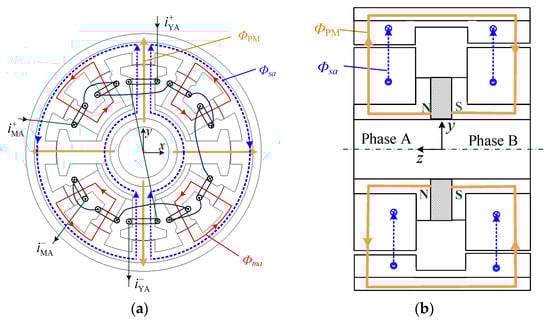 Figure 2 shows the magnetic circuit and a cross-section of the machine. It can be seen that the torque control coils and the suspension control coils are stacked on the torque poles and the suspension poles respectively. The control coils on the eight torque poles of each phase are connected in series to form a torque winding to generate a quadrupole torque control magnetic flux to drive the rotor, which flows through the torque pole, the air gap, and the outer rotor. The suspension control coils on the two suspension poles are arranged in series to form two sets of suspension windings in an orthogonal direction, and the two-pole suspension control magnetic flux generated after energization flows through the suspension pole, the air gap, and the outer rotor. The axially-magnetized PM simultaneously provides a suspension bias magnetic flux for the radial four DOF to reduce the suspension power consumption. It flows through the phase A stator sleeve, the phase A suspension pole, the phase A air gap, the phase A rotor, the rotor sleeve, the phase B rotor, the phase B suspension pole, and the phase B stator sleeve. By adjusting the direction of the control flux to superimpose or reduce the bias magnetic flux , the suspension force required for the four DOF suspension can be generated.