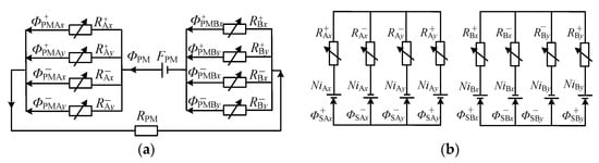 Equivalent magnetic circuit of the suspension system. (a) Bias magnetic circuit; (b) Suspension pole control magnetic circuit of Phase A and Phase B.