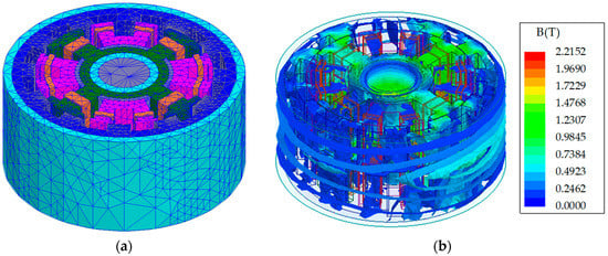 Three-dimensional FEA model of the proposed machine. (a) Mesh grid of FEA; (b) Magnetic field intensity distribution.