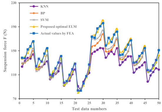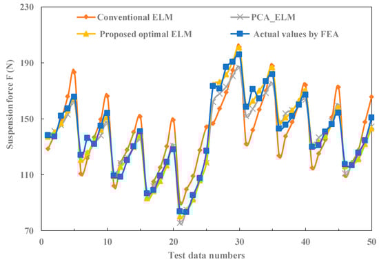 Figure 8 shows the comparison curves of the three numerical models of the conventional ELM, PCA-ELM, and the proposed optimized ELM. Table 5 shows RMSE values of the predicted and actual suspension force obtained by the three methods. Combined with Figure 8 and Table 5, we can clearly see that the conventional ELM model has a low degree of accuracy, and that the RMSE reaches 12.5643, which means that it is unlikely that it will be able to meet the requirements of subsequent suspension control in spite of its short calculation time. Preprocessed using the PCA algorithm, the computing cost and accuracy of the PCA-ELM model are slightly improved, but due to the randomness of the weight and bias parameters of the ELM network, the improvement is insignificant. Compared with the former two, the proposed optimal ELM combines the advantages of PCA and conventional ELM algorithms, and introduces the DE algorithm to obtain the optimal weight and bias parameters of the neural network, which has higher prediction accuracy. The RMSE value is 4.2907, only 34.15% of conventional ELM and 38.76% of the PCA-ELM, which demonstrates the accuracy and effectiveness of this algorithm.