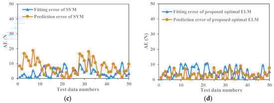 The 625 sets of data after dimension reduction in Table 4 are divided into two groups according to the steps described in Part 3.3, wherein 525 sets of data are training sets which are used to determine the input weight and hidden layer bias of the numerical model, while the remaining 50 sets are used as test sets to verify the accuracy of the predicted values of the ELM model. In order to verify the effectiveness of the proposed DE optimized ELM algorithm, this paper uses the same training and testing set data to perform regression analyses on the PCA-ELM algorithm and the proposed optimized ELM algorithm, and compares them with the predicted values obtained by the conventional ELM algorithm under the same 625 data sets. In order to further explain the accuracy of the prediction model built using the DE algorithm, the RMSE of the predicted values is introduced as the evaluation index. The RMSE definition is as shown in Equation (15).