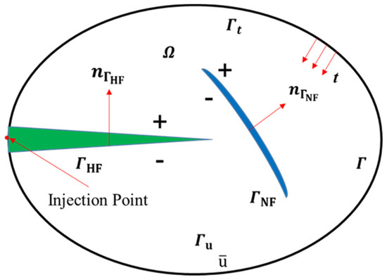 As indicated in Figure 1, a 2D homogeneous medium () contains a natural fracture , which can interact with the . The prescribed tractions t and the displacements are imposed on the boundary ( and , respectively). For simplicity, it is assumed that the fluid is incompressible and that the propagation of the fracture is a quasi-static process. The fracturing fluid leak-off into the matrix is considered by the Carter leak-off model.