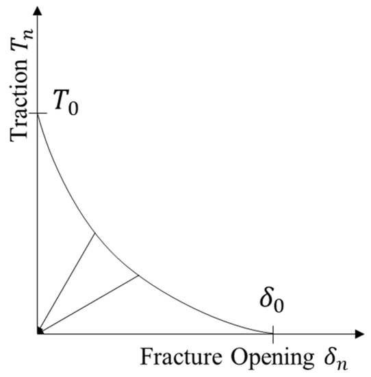 Damage modeling can be used to simulate the degradation and ultimate failure of the strengthening elements. The failure mechanism consists of two parts: the damage initiation criterion and the damage evolution law. In this law (Figure 2), the element does not undergo damage under pure compression unless the traction reaches the cohesive strength or if the separation reaches the displacement of damage . When exceeds , the traction decreases to 0 as the displacement increases and the cohesive element is completely damaged.