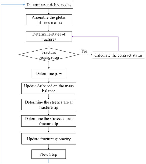 The hydraulic fracturing model presented in this research involves three physical processes: (1) deformation of rock surface, (2) hydraulic fracture propagation induced by the hydraulic pressure, and (3) interaction between natural fractures and the hydraulic fracture. The coupled problem can be solved by three main steps during each time step. The first step involves determining the state of each fracture, i.e., whether the HFs are driven by fluid and the contact status of each NF. The Newton–Raphson iterative method based on the penalty method is adopted to solve the discretized non-linear equilibrium equation to determine the contact status. The second step involves iteratively solving the coupling between the deformation of HFs and the fluid flow within the fractures using the Newton–Raphson method. The third step involves calculating the stress state of each fracture tip; then, the location of each fracture tip is updated according to the crack propagation criterion. Figure 4 shows the flow chart of the coupled approach within each time step.
