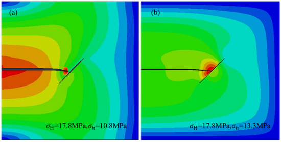 Effective stress distribution around the fractures: (a) stress difference of 7.0 MPa; (b) stress difference of 4.5 MPa.