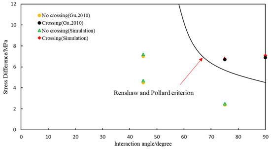The published experimental results in Reference [19] were used to verify the effectiveness of the model. To improve the model’s computing speed, a 2D hydraulic fracturing model with coupled fracture surface deformation and pore pressure was proposed (see Figure 2). The dimensions of the model were 100 × 100 m2, the length of the natural fracture was 6.0 m, and the injection position of the fracturing fluid was located at the left edge of the model. The Young’s modulus E and Poisson’s ratio were 21.6 GPa and 0.28, respectively. The tensile strength of the rock sample was 6.28 MPa, and the other parameters of the model were consistent with the experiment. The simulation was considered completed when the HF came across the NF. The effective stress distribution around the fractures with an interaction angle of 45° is shown in Figure 5. When the stress difference was 7.0 MPa, it is evident that a stress concentration formed at the tip of the hydraulic fracture, which demonstrates that no shear slip occurred along the natural fracture surface. When the stress difference was decreased to 4.5 MPa, the stress concentration mainly appeared along the natural fracture surface; thus, it can be concluded that a slip failure occurred along the natural fracture surface. From the extended Renshaw and Pollard criterion [20], the interaction between the HF and NF can be predicted, and the comparison results between numerical simulations and experimental results are shown in Figure 6. The comparison indicates that the numerical results were consistent with the experimental results.