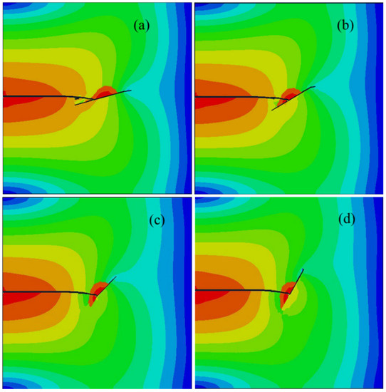 The effective stress distribution with four different interaction angles: (a) 15°; (b) 30°; (c) 45°; (d) 60°.
