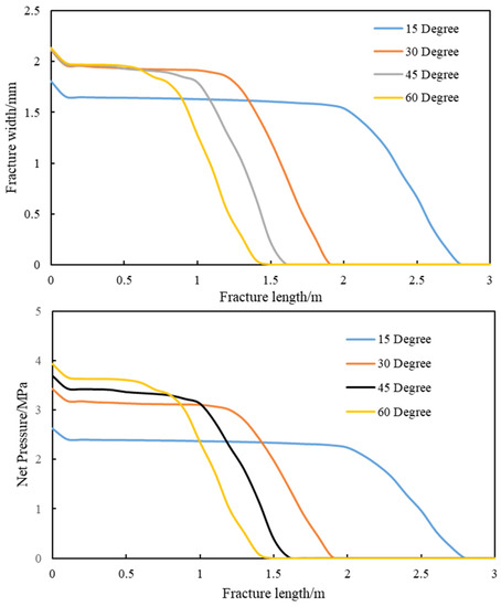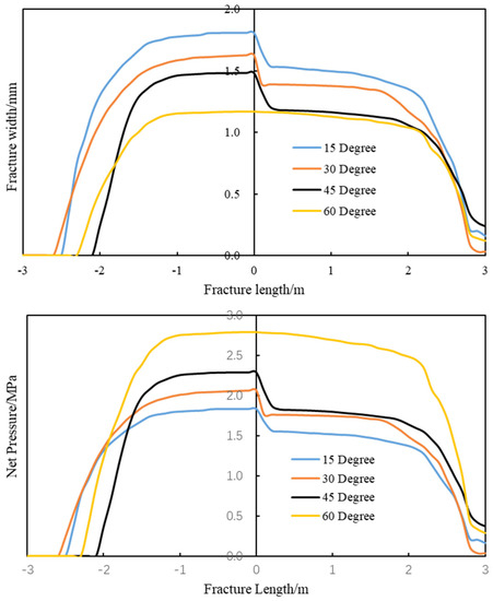 In the simulation, the four edges of the model were fixed, and the initial porosity of the model was 3.7%. It was assumed that the reservoir was homogeneous, and the natural fracture was closed completely. The dimensions of the model were 100 × 100 m2, and the injection position of fracturing fluid was at the middle of the left edge. The frictional NF, with a length of 6 m, was located in the middle of the model, in order to effectively decrease the boundary effect caused by the model size. The other parameters in the model are shown in Table 1. From the simulation results, it was demonstrated that a T-shaped fracture network formed when the interaction angles were 15° and 30°, while it changed to an L-shaped fracture network when the interaction angles were 45° and 60° (Figure 7). The stress concentration mainly occurred along the natural fracture surface. Figure 8 indicates that the natural fracture and net pressure in the natural fracture were asymmetrically distributed along the fracture length. The upper branch had a longer extension length than that of the lower branch, but the fracture width of the upper branch was obviously smaller than that of the lower branch.