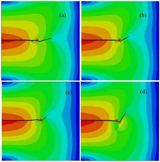 Next, a similar hydraulic fracturing model was established to discover the different interaction mechanisms between the hydraulic fracture and natural fractures. In this model, the frictional natural fracture was changed to a cement natural fracture; furthermore, the rock toughness () was set as 2.5 MPa∙m1/2, and the natural fracture toughness () was set as 1.4 MPa·m1/2. The critical strain energy release rate ratio between a cement NF and the rock matrix was 0.36. When the interaction angles were 15°, 30, 45°, and 60°, the magnitudes of the strain energy release rate ratio were 0.731, 0.547, 0.481, and 0.374, respectively, which were higher than the critical strain energy release rate ratio. Thus, the hydraulic fracture was arrested by the natural fracture and propagated along the upper branch of the natural fracture; thus, an L-shaped fracture network formed (see Figure 9). The lower branch of the natural fracture kept its initial state without opening and had no influence on the interaction between NF and HF, as the bottom of NF was bonded by the cement. Under this condition, the stress concentration mainly formed at the tip of the HF. The fracture width and net pressure of the natural fracture along the natural fracture is indicated in Figure 7. It can be concluded that the fracture width of natural fracture decreased with an increase in interaction angle. However, an abrupt change occurred at the interaction point and, thus, a higher net pressure was created.