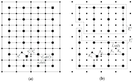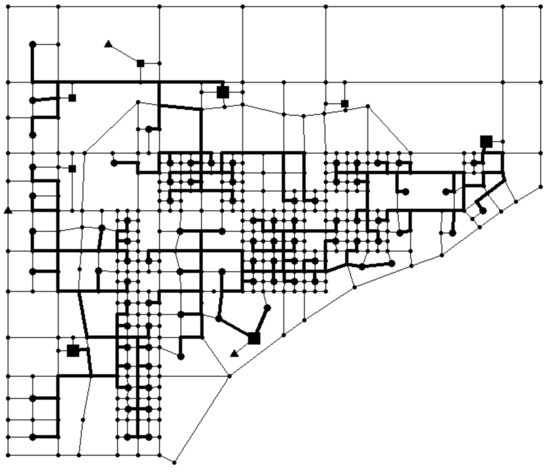 , can be divided into four subsets, denotes the energy sources set, represented by triangles in the graph, such as water resources, ground sources, and where the energy station absorbs energy. The position of the energy source has a great influence on the selection of energy stations. They would be closer with better energy efficiency and economy. denotes the set of energy stations, represented by small squares in the graph. denotes traffic intersection sets, represented by small dots on every intersection of two lines. denotes blocks to be served in the design region set, represented by big dots. denotes city road sets, along which the pipeline should lay according to specification. is a 0–1 variable, reflecting the adjacency relationship between two vertexes. denotes the load set of vertexes . denotes the weight set of edges, representing the costs of the pipeline.