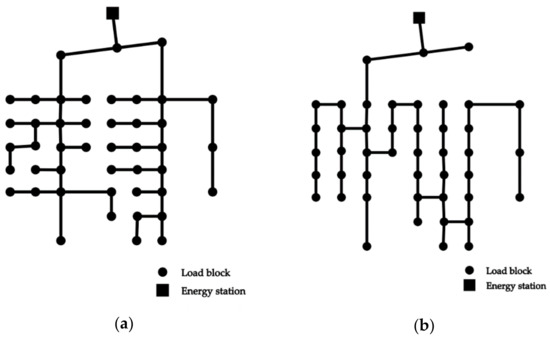 The Prim algorithm is one of the most common greedy algorithms for a weighted undirected graph to find its minimum spanning tree, including every vertex in it, where the total weight of the edges in the tree is minimized. The basic idea of this algorithm is that it operates from an arbitrary starting vertex, one vertex at a time, and at each step it adds the cheapest possible connection, until vertexes are added to the spanning tree. The transmission and distribution network is characterized by the network topology, and the best layout can be calculated [32,33,34,35,39,40]. However, the calculations of most of the studies directly use the Prim or Kruskal algorithms with a distance weight set, and not enough details. This paper puts forward an improved Prim algorithm in accordance with the design idea of cold and heat pipelines of HVAC. It operates from the vertex representing the energy station. The weight set represents the costs of the edges, and the weight of every added edge is updated at every step. For example, the small blockage denotes an energy station for hot water supply, and the dots denote several load points. The best pipeline network layout is calculated by using the Prim and improved Prim algorithm, respectively. The calculation result of contrast is shown in Figure 3. The layout (a) of pipelines could be more uniform and stable by using the improved algorithm. The total pipeline length of (b) could be shorter, but the most unfavorable pipe section is much longer than in (a), which means the on-way resistance is obviously and unreasonably large.