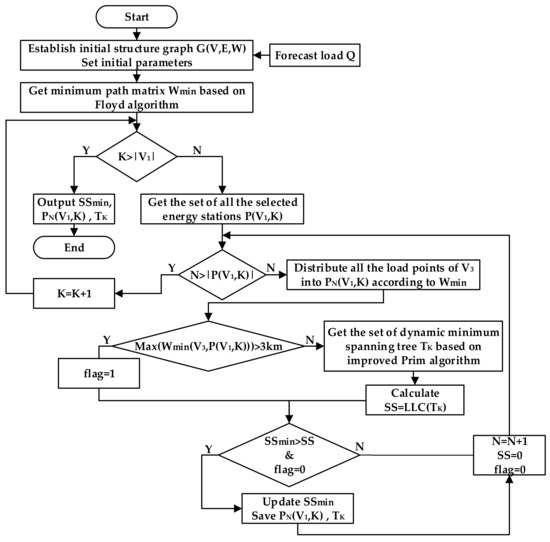 In the flow chart of the regional energy system’s optimum economic distribution algorithm, is assumed as the set of dynamic minimum spanning trees, and is a cyclic variable that represents the number of elements of the tree in the set of . is assumed as the set of selected energy stations, is a cyclic variable that represents the number of elements in the set of , and represents the nth element of the set .