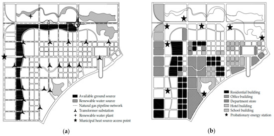Regional distribution. (a) Energy resources distribution; (b) Load blocks and preparatory energy station distribution. Adapted from China Shanghai architectural design and research institute Co., Ltd. [42].