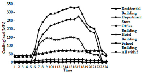 Finally, the design load of every block and the total load of the region were obtained. The total cooling load is 329.97 MW, and total heat load is 130.88 MW. Part of some blocks’ cooling load results are shown in Table 4. The biggest load is at 5 pm, and the department store accounts for the largest portion of the region’s total load, as shown in Figure 6.