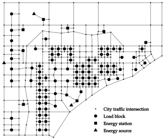 The structure graph of this region is drawn based on graph theory, and its prototype comes from the original city planning diagram. As is shown in Figure 7, the energy resources, like the water resources, the access point of the municipal heat source, and so on, are represented by triangles in the graph. The numbers of the load blocks and city traffic intersections are 85 and 409, respectively.