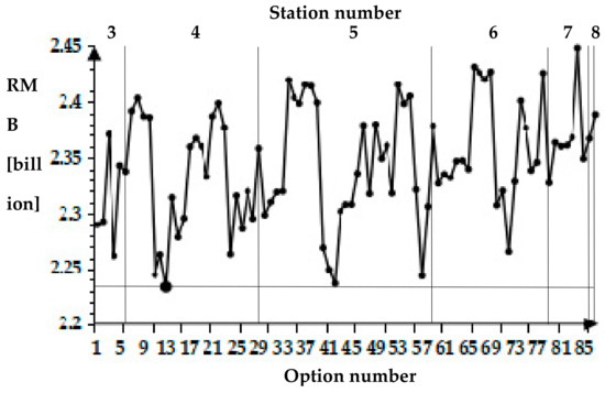 In the simulation by MATLAB R2014a, the eight preliminary energy stations provided 255 options in total, and under the constraint conditions, 87 options were still available. Figure 8 shows that there is a great difference in the costs of different options and network layouts. The maximum of life cycle costs reached 2.45 billion RMB, 9.8% more than the lowest. This result provides us with an optimal choice, represented by bigger dots in Figure 8, with the lowest life cycle costs.