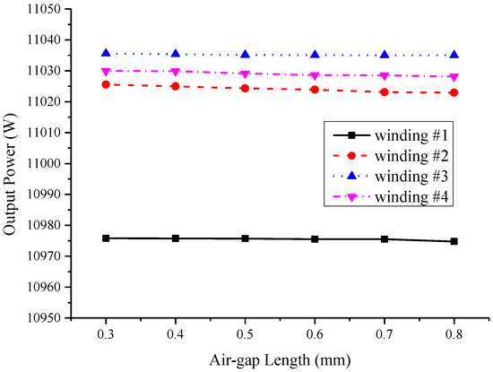 - Assuming rotating speeds n1 and n2 (n1 ≠ n2, unit: rpm) that are a little less than the synchronous speed as the input speeds, calculate their output torques T1 and T2 by the time-stepping FEM and the empirical equation [21], respectively. Note that output torque Tj is calculated by:In Equation (5), p denotes the number of pole pairs, D1out denotes the stator outer diameter and its unit is m, Tem denotes the electromagnetic torque computed by the time-stepping FEM. If:then the speed fulfilling Equation (6) is the full-load speed and the algorithm goes to Step 4; otherwise, subscript i = 3 and the algorithm goes to Step 2. In Equation (6), Tn denotes the full-load torque 70.8 Nm corresponding to 11 kW output power and ε denotes the allowable error.
