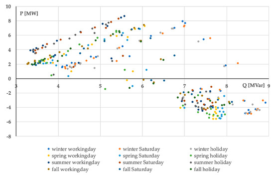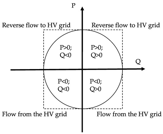 In the paper, for the sake of simplicity and without lack of generality, the real distribution systems are supposed as interfaced with the high voltage (HV) grid by the primary substation (PS), that represents the point of common coupling where the MV distribution system (DSO managed) is connected to the HV transmission system. Such a TSO/DSO interface is constituted by one or more dedicated HV/MV transformers. The position of the TSO/DSO interface has to be adapted to a specific grid code or regulatory framework but, in the case of the paper, the transformers are owned by the DSO, thus, the TSO/DSO interface is the HV node. In other cases, the transformer may be owned by the TSO, so the TSO/DSO interface becomes the MV busbar of the transformer. Whatever the TSO/DSO interface position, before the massive connection of generation to distribution systems, the energy flowed uniquely from transmission to distribution throughout that interface. Nowadays, at the interface point, bidirectional flows of energy are frequent, and energy can often flow from distribution networks towards the transmission system. A good equivalent model that represents the distribution system behind the TSO/DSO interface is a power plant that could theoretically operate on four quadrants by including both positive and negative values of active and reactive powers, with a circular capability curve or even rectangular, if active power P and reactive power Q can simultaneously assume their maximum values (Figure 1). In practice, the reactive power flow through the interface is often only inductive (Q > 0) and thus, during the year, the setpoints of the equivalent power plant are all placed in the right two quadrants, that represent positive reactive powers. For instance, in Figure 2, each dot represents a couple of (P, Q) that characterizes the TSO/DSO interface in a generic time interval of the year (i.e., 1 h) of a given PS that supplies a network on which many DG plants, renewables or not, have been connected. The colors indicate the typical day relevant to the time interval. The dots in the negative half-plane of P signify a reverse flow towards the HV system. The capability curve of such a power plant can be considered the envelope of the area covered by these points.