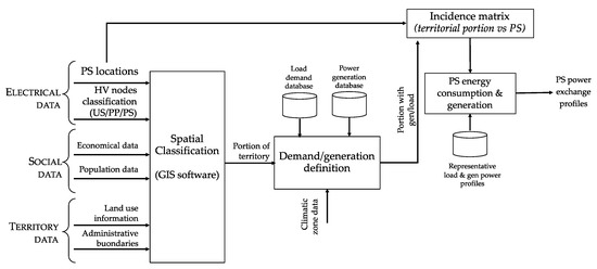 In the proposed methodology, such estimation has been made with considerations and calculations that arise from global data of electric demand and production of a given region or area, provided by public or semi-public bodies involved in the transparency activities related to the electricity and from other assumptions regarding territorial and socio-economic information. This information is related to the demography, the land cover and usage, as, for instance, the number of buildings, the number of employees, etc., and can be useful to characterize the area served by a given PS, as detailed in the following Section 3.