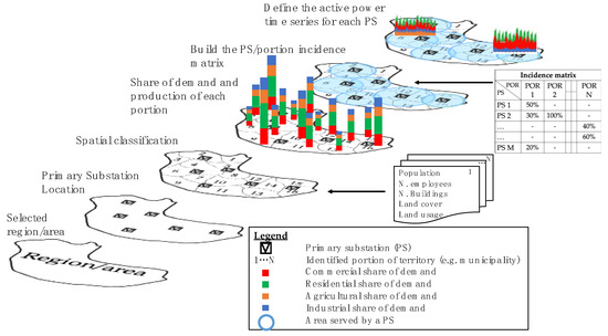 In this work, the greatest attention has been paid to develop a consistent and repeatable methodology that uses only publicly available open data since not all players have access to classified information. In fact, from the energy traders’ side, privacy regulations and market competition strongly limit the availability of consumption and production profiles at the distribution level and they are known only by energy suppliers and aggregators for the restricted group of their customers. However, some data about the transmission power systems and about the territory and the socio-economic situation are open or saved in repositories and databases that can be freely requested, or in a few cases, purchased from semi-public institutions. Obviously, these data are not ready to be used as they are, but if suitably managed and combined, they may be a valid help for modelling the behavior of distribution networks. The proposed methodology exploits even raw open data, processed for extracting the maximum level of information, but, clearly, the more precise and ready the input the more reliable the results Furthermore, the procedure is also able to reach the goal if it is available a limited quantity of data, but, in this case, it is necessary hypothesizing the most important missing data. In practice, for obtaining reliable and accurate results, the total demand and production of the whole area, the PS locations, the share of population in the portions on which is subdivided the area, and, at least, the rough land cover for assigning the ambit (rural, industrial and urban) are needed. On the contrary, if in a given case there is also specific information available, generally unknown, the procedure can properly include it (e.g., the consumption/production profile of one load/generator known by a measurement campaign).