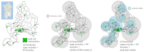 Procedure for assigning for creating an incidence matrix to associate each municipality area with one or more PSs: (a) Territorial segmentation + PS location, (b) circles of the first attempt, and (c) adjusted circles.