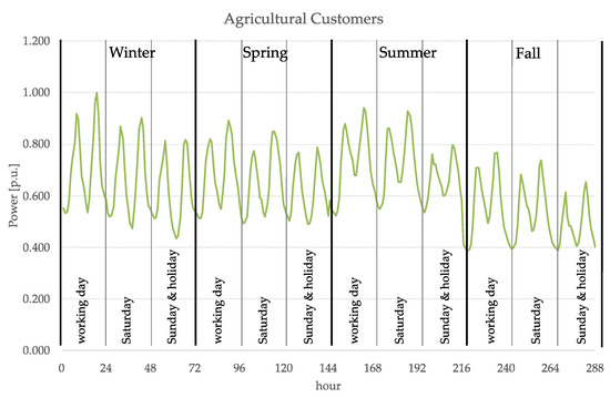 Anyway, global figures, as the yearly energy consumption and production, are not enough for modelling the behavior of the distribution system. Time series of consumption and production are necessary to properly represent the impact of demand coincidence and generation/load homotheticity (item 6). Thus, in this paper, hourly curves are built by using twelve daily power representative profiles that model the consumption in typical days of the year (i.e., working days, Saturdays, and holidays for the four seasons, respectively) for agricultural, industrial, residential, and tertiary (i.e., commercial and offices) loads, derived from a digital archive of Italian representative distribution networks [9]. Figure 6, Figure 7 and Figure 8 show the typical daily profiles used for the agricultural, industrial, and tertiary customers, respectively. Such curves define the relative coefficients that, hour by hour, have to be multiplied by the annual peaks for obtaining the absolute consumption profiles. By observing the typical daily profiles, it is evident that while the peak of agricultural consumption occurs in the winter working day (i.e., when the curve reaches 1.0 p.u), it occurs in the summer working day for the other categories of customers (i.e., industrial and tertiary).