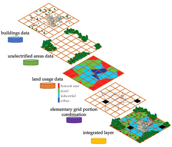 The authors, within the ATLANTIDE project (Archivio TeLemAtico per il riferimento Nazionale di reTI di Distribuzione Elettrica” that means “Digital archive for the national electrical distribution reference networks”), have co-authored a methodology and contributed to building a repository of representative networks for the Italian distribution system. The network topology, the feeder type (e.g., overhead and underground), the distribution of different customer categories (i.e., residential, industrial, agricultural, tertiary, transportation), and the daily consumption and generation profiles, etc., were used to build representative networks for urban, industrial, and rural areas [9]. Without a lack of generality, portions of the ATLANTIDE representative networks have been considered in the model proposed in this paper, but any other representative networks can be used instead of them (for instance, the models in References [27,28]). In particular, elementary portions of the ATLANTIDE representative networks have been used to build synthetic networks downstream of each PS that, as from the meaning of such kind of network models, do not correspond exactly to the actual networks but can characterize them in a realistic way. Figure 11 depicts the developed approach within the GIS application: layers that include information about buildings, unelectrified areas (i.e., lakes, ponds, forests, etc.), land usage, and cover are superimposed on to each other for building synthetic networks that result from a combination of elementary network portions located in an integrated final layer. Such an approach can be summarized as follows: