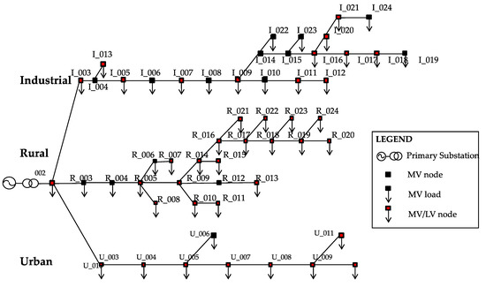 The elementary network portion used to describe a distribution network supplied by a PS in a given area, whose consumption/generation patterns have been developed with the methodology in Section 3, is the representative feeder. Particularly, rural, industrial, and urban representative feeders have been defined under the following assumptions: