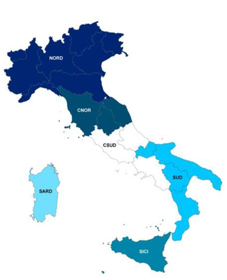 The proposed methodology has been applied to six Italian regions that represent three of the six NTG zones on which the Italian territory is subdivided: the two biggest islands, Sicily and Sardinia, that constitute one NTG zone each (SARD and SICI respectively), and the regions Puglia, Basilicata, Molise, and Calabria, in the south-east of Italy, that are grouped in the NTG zone named SUD (Figure 13). Molise and Basilicata are respectively, the second and the third smallest regions in Italy, after Valle d’Aosta in the north Italy. Calabria and Puglia can be identified as the toe and the heel of the Italian boot, respectively. The total number of examined NTG nodes is almost 800 and more than half (i.e., 477) are public PSs.