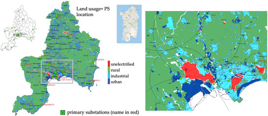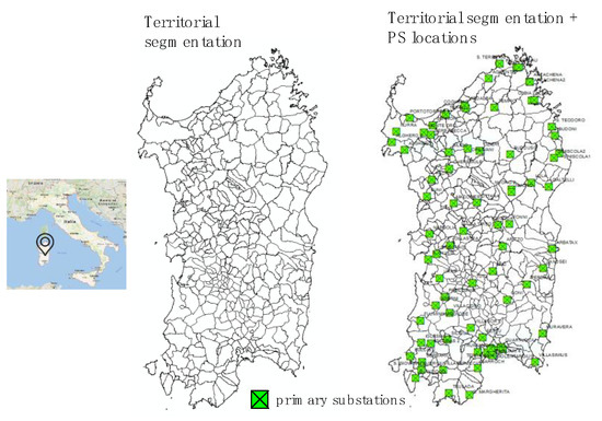 In order to clarify the details of the methodology, let us consider the Sardinia Island, which is characterized by an area of 24,090 km2, sparsely populated by 1.6 million inhabitants, supplied by 152 HV/MV primary substations, 79 of which are public PSs. The smallest portion of territory used for the territorial segmentation is the municipality. In Figure 14, such territorial segmentation of the region and the public PSs position are shown.