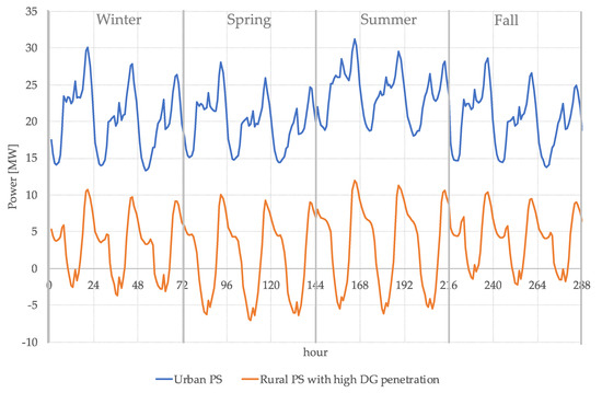 Finally, according to the consumption category percentage obtained with the spatial classification, and by combining the daily reference load profiles of the different categories of customers (Figure 6, Figure 8 and Figure 10), the consumption profiles of each HV node of the whole Sardinian power system have been assessed. According to the information about the installed power generation provided by Reference [24], these profiles have been adjusted by considering the production of each PS (in Sardinia, PV generators installed at the distribution level are predominant). The resulting profiles represent, for each time interval and for each PS, the expected exchanged power through the HV/MV transformers, that represent the TSO/DSO interfaces. It is worth noticing that economic, social, and demographic characteristics and RES availability strongly impact on the shape of load/generation curves and the energy quantities, that obviously follow the law: the greater urbanization the higher the consumption. For instance, in Figure 16, the resulting exchange profiles of two PSs, one in an urban area and one in one predominantly rural area, with a high share of DG. The first is characterized by high demand (positive), while the second shows power flow inversions (negative) through the HV/MV transformer, mainly during spring and summer, due to the high quantity of PV installed.