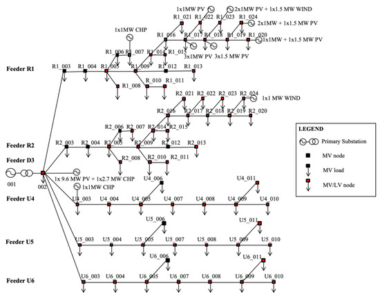 From the procedure described in Section 3, the PS No. 52 of Table 6, considered for this example, feeds customers that consume 81.4 GWh/year. The resulting share of ambits, derived from the GIS application, by intersecting shapefiles of buildings, unelectrified areas, and land usage of the served territory, is 92.5% of rural, 6.2% of urban, and 1.3% of industrial ambit, respectively. In Figure 17, the PS synthetic network is shown. The model provided by the proposed approach is constituted by six feeders, two of rural ambit (feeder R1 and R2), one dedicated feeder for the biggest PV and CHP power plants (feeder D3), and three urban feeders (feeder U4–U6), two of which are passive feeders. The total installed DG capacity power is about 26 MW of PV, 2.5 MW of WIND, and 5.2 MW of CHP. In this case, the DG position is chosen and distributed at the end of only one of the rural feeders for the PVs, and at the end of the two rural feeders for the WIND turbines, while the CHP is considered concentrated at the beginning of one rural and one urban feeder. Furthermore, the dedicated feeder includes two known existing plants, one 9.6 MW PV and one 2.7 MW CHP. The difference between the annual consumption of the real network and the model is about 8.6%, while the deviation from the hypothesized DG scenario is about 1.3 %.