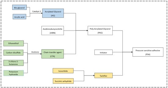 Design block flow diagram of PSA production plant. Catalyst 1 included amberlyst 15 and phenothiazine (PTA). Acrylated glycerol (AG) production process is highlighted in blue block. Chain transfer agent (CTA) production process is highlighted in green block. The tackifier production process is highlighted in yellow block.