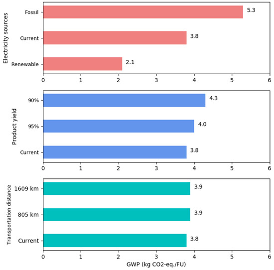 One way to investigate uncertainty associated with the product value due to input variable variation is by using a sensitivity analysis [45] In the environmental impact assessment, electricity source, transportation distance and product yield are chosen based on their potential impact on GHG emission, represented by GWP result. Electricity source in the base case scenario was ~60% of fossil fuel; due to the large reduction in GHG emission by replacing electricity from renewables, sensitivity analysis on electricity sources (fossil fuel or renewable fuel) were investigated. GHG emission was reported to increase ~35% with a 50% increase in transportation distance for a centralized biorefinery plant [46]; thus, it has the potential to be a sensitive input as well. Product yield was selected due to the uncertainty associated with the production process itself. In the economic feasibility analysis, we explored the sensitivity of non-operating parameters on unit production cost. For instance, the impacts of raw materials costs and labor cost are explored within ±10%; the impact of working capital and project contingency reflected through total capital investment varies between −30% to 50% [47].