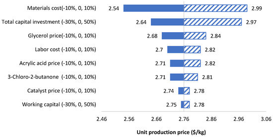 Sensitivity analysis was further performed on the 40 t/d PSA production plant in terms of unit production price (Figure 6). Materials cost was the most sensitive factor to the unit production cost among all input variables. This corresponds to the previous discoveries in annual operating cost that materials cost was the driving force of the plant. By decomposing materials cost, we found that glycerol price, acrylic acid price, 3-chloro-2-butanone price, and catalyst price were among the top most sensitive factors. Glycerol price varied within ±10% in this sensitivity analysis in order to be consistent with other raw materials; however, glycerol obtained in the petroleum refinery plant can be as low as $0.2/kg [35]; thus, the unit production price in this situation may be $2.11/kg. Even though obtaining glycerol from petroleum plant has more economic advantage, its associated environmental impact may increase ~35% compared to bio-glycerol source [27]. Total capital investment was the second parameter that had the largest influence on the unit production cost. Due to the contingency of the TEA project, the unit production cost may vary between $2.64/kg to $2.97/kg. Labor cost was another sensitive factor in this study, which suggests that the unit production price may increase to $2.82/kg if we consider administrative cost, supervisory cost and other labor costs. However, all the sensitive parameters found in this study belongs to non-operating parameters. It is recommended to include operating parameters in the future analysis to explore how operating condition changes may impact the economics. In addition, since PSA can also be prepared from other polymerization process such as photoiniferter polymerization, which has the ability to maintain the radical at a low concentration and ambient temperature [51], future TEA and LCA research could also focused on exploring the most sustainable polymerization process in PSA production.