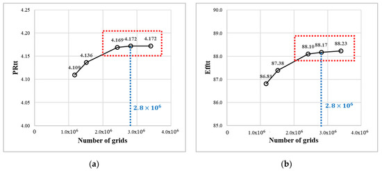 Grid independency test of the base compressor. (a) Total-to-total pressure ratio; (b) total-to-total efficiency.