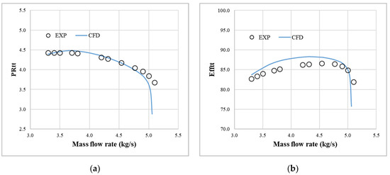 The grid independence study is shown in Figure 4a,b, and the total-to-total pressure ratio and the total-to-total isentropic efficiency are compared. As a result, the relative error decreased from more than 2.4 million grids to less than 0.1%. Thus, approximately 2.8 million grids were selected for this study, taking into account some margin. To predict the performance of the impeller, the 3D Steady Reynolds-Averaged Navier–Stokes equations were solved using ANSYS CFX software (19.3, ANSYS, Canonsburg, PA, USA). The SST turbulence model was used as the turbulence model, and the CFD results of the impeller of the base compressor were compared with the experimental data to validate the analytical method of this study [22]. The performance curves are shown in Figure 5a,b. The total-to-total pressure ratio is in good agreement with the experimental results. For the total-to-total efficiency, the CFD results were predicted to be approximately 1.5%–2% higher than the experimental results. Because the CFD was calculated for adiabatic conditions, the CFD efficiency value was slightly higher than the experimental value.