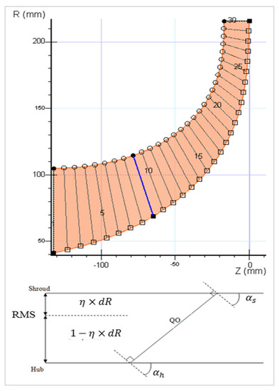 The flow cut method reduces the flow rate by decreasing the impeller passage height, as shown in Figure 1b. When this method is applied, the performance curve is shifted to the left (in the direction of decreasing flow rate) because the passage area is reduced. Thus, this method is used to design compressors with different performances by reducing the flow rate. In this study, the passage area inside the impeller was calculated using the annulus area. The annulus area is calculated using the quasi-orthogonal (QO) lines, as shown in Figure 6. The following Equations (1)–(2) are used to calculate the annulus area.