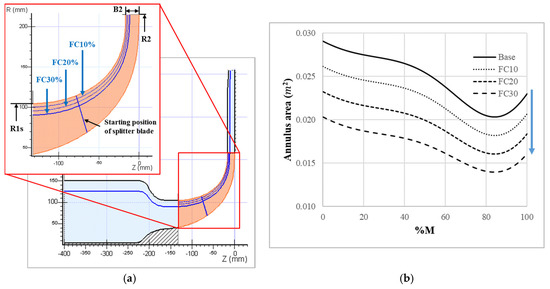Aerodynamic design of FC10, 20, and 30 models corresponding to fractions of 0.9, 0.8, and 0.7 of the annulus area of the base compressor using the flow cut method. (a) Meridional view; (b) decreased annulus area with respect to the flow cut method.