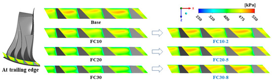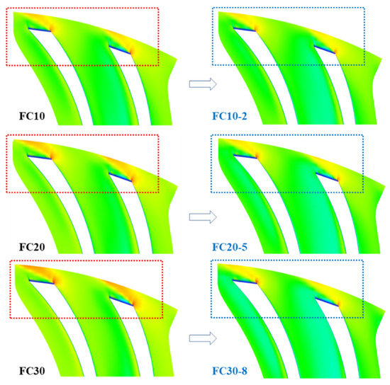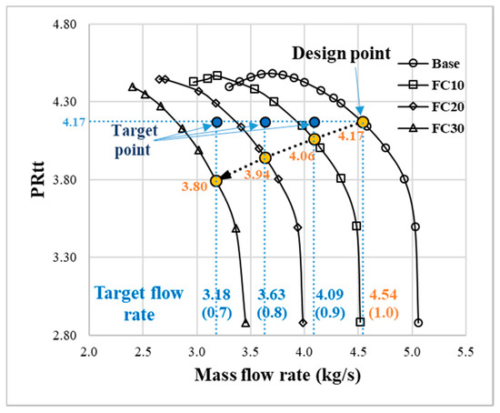 Figure 12 shows the CFD results at the target flow rate after applying the combined flow cut and axial lift method. The total-to-total pressure ratio was constantly increased by increasing B2, as shown in Figure 12b, and the impellers with a total-to-total pressure ratio that was approximately the same as that of the base impeller were FC10-2, FC20-5, and FC30-8. Figure 13 shows the performance curves of FC10-2, FC20-5, and FC30-8 using the combined flow cut and axial lift method. The total-to-total pressure ratio at the target flow rate is almost the same as the total-to-total pressure ratio at the design point of the base impeller.