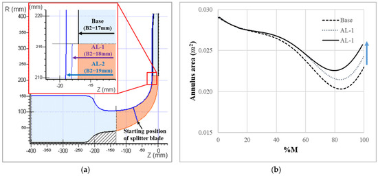 Aerodynamic design of AL-1 and AL-2 with the B2 value increased by 1 mm and 2 mm over the B2 value of the base impeller using the axial lift method. (a) Meridional view; (b) increased annulus area with respect to the axial lift method.